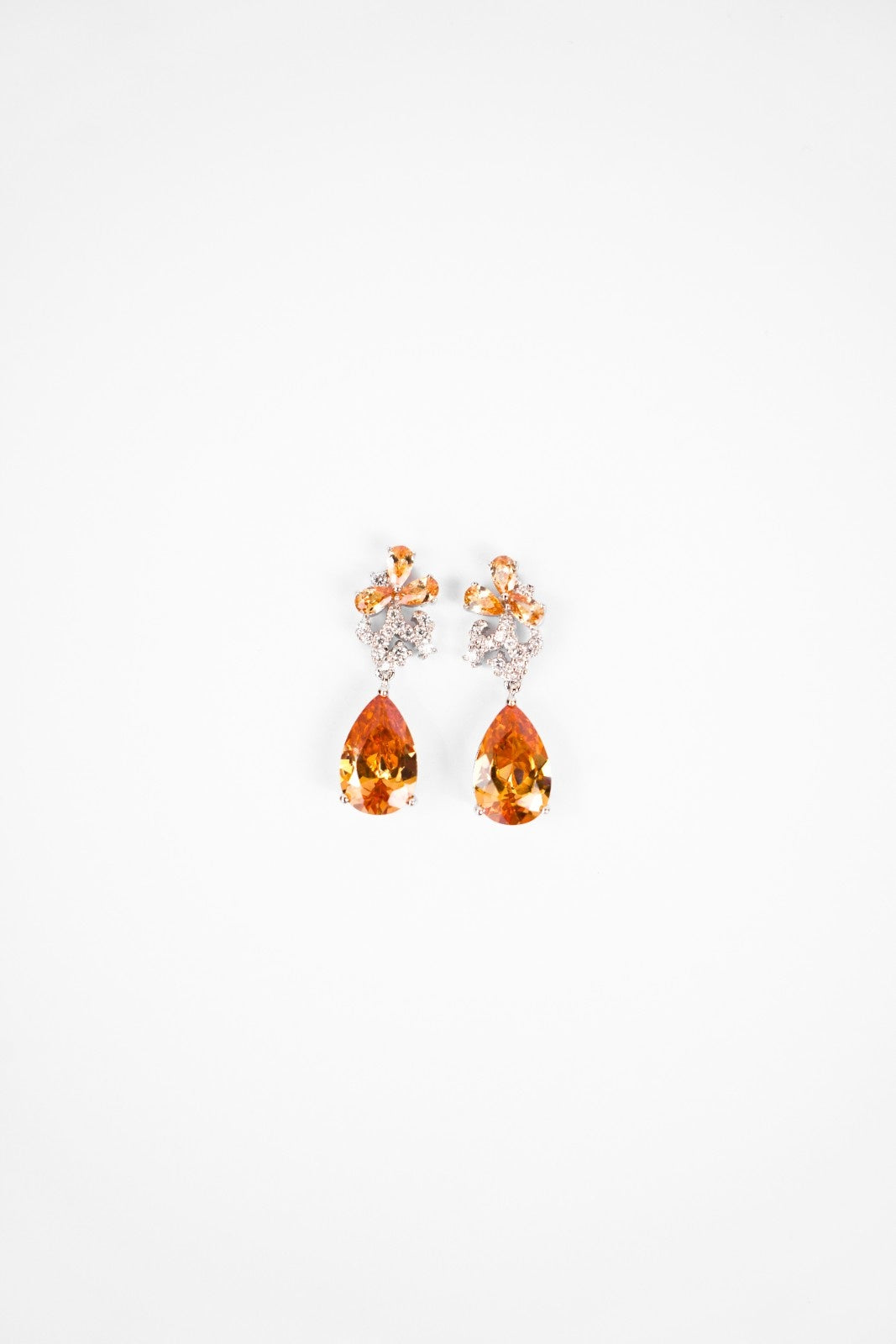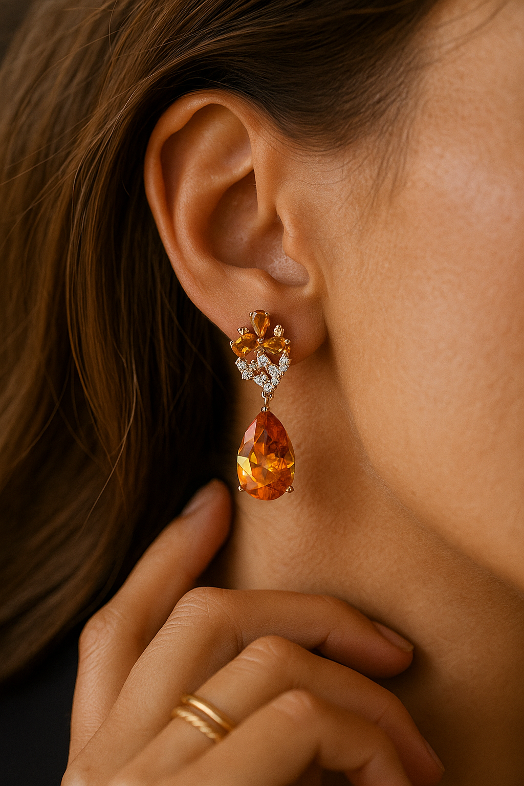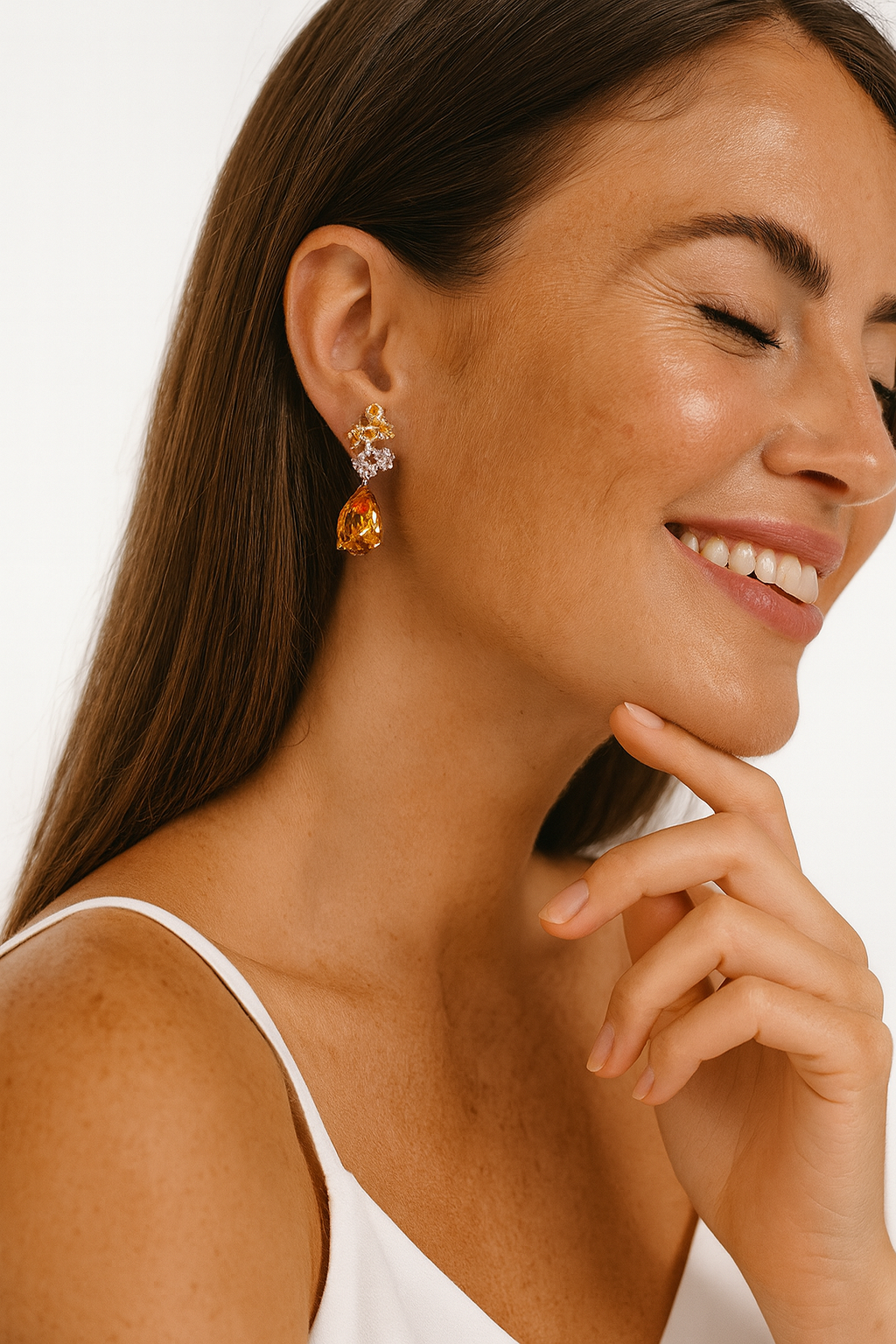 Where warmth meets brilliance — the Amber Dusk Drops radiate a captivating glow inspired by the golden hues of twilight. Featuring teardrop-cut amber stones suspended from a floral cluster of crystal brilliance, these earrings capture the delicate balance between fire and elegance.