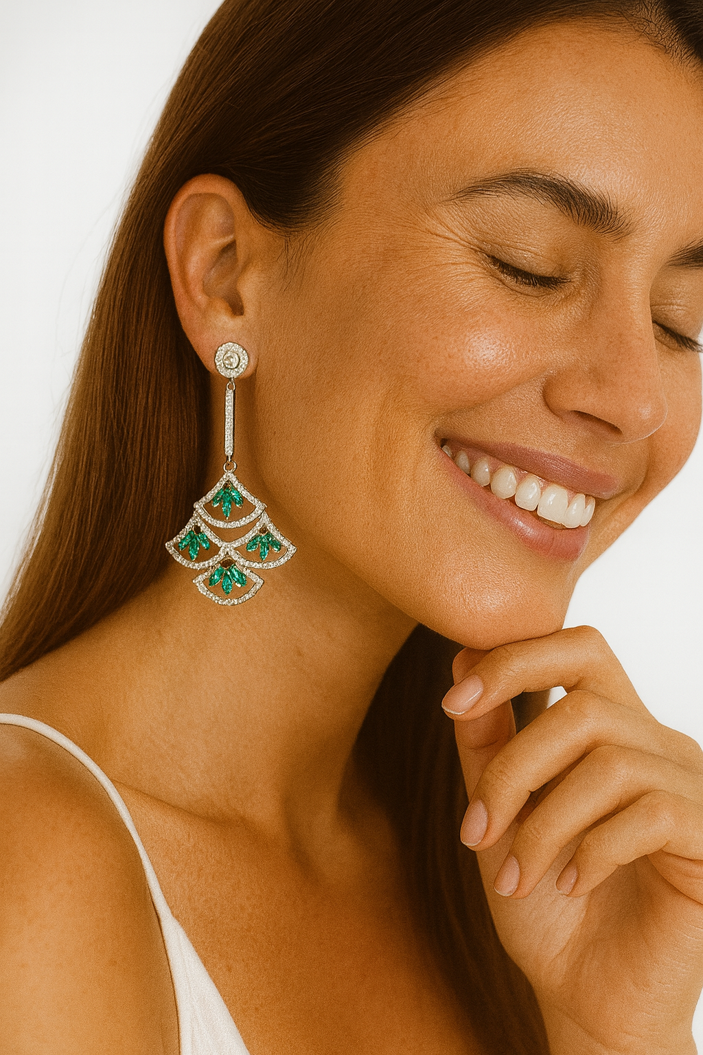 Let the Emerald Cascade Drops dazzle against an elegant gown or a minimal neckline — ideal for galas, formal dinners, or moments that call for undeniable sophistication.