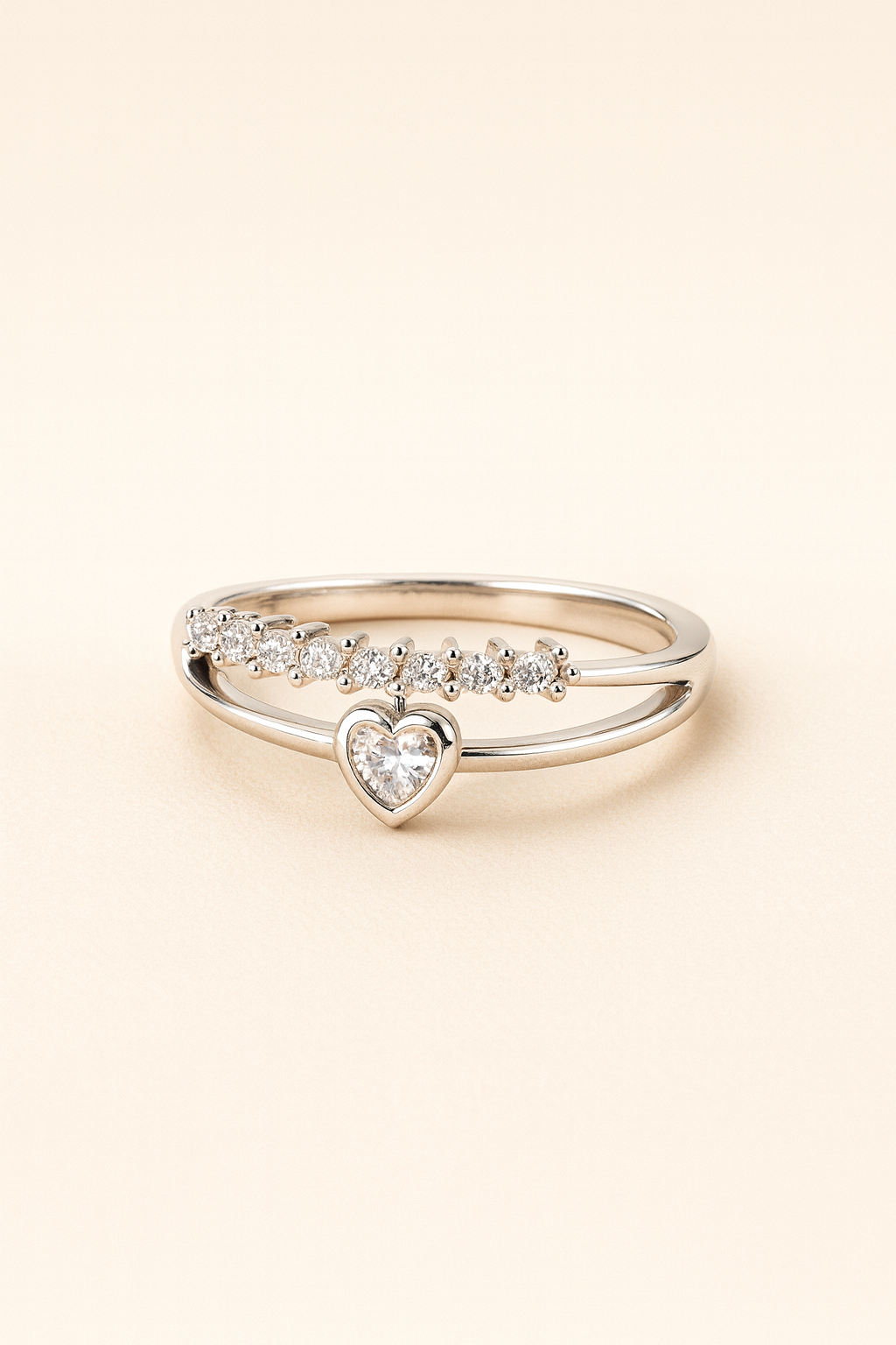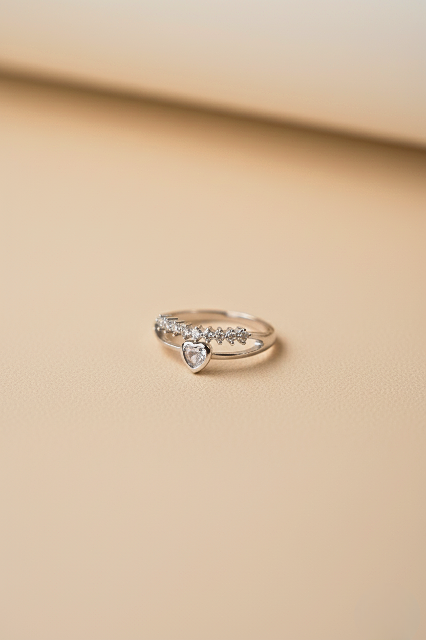 Illuminate your elegance with the Lustre Heart Ring, a masterpiece that celebrates timeless beauty and romance. Featuring a finely cut heart-shaped zircon embraced by a graceful arc of sparkling stones, this piece captures the essence of sophistication and charm. Its luminous silver finish radiates understated luxury, while the adjustable band ensures a perfect, comfortable fit for any hand. Designed for the modern muse, the Lustre Heart Ring effortlessly transitions from daily wear to evening allure — a reminder that true elegance never fades. Each ring is meticulously crafted to be tarnish-free, hypoallergenic, and water-resistant, ensuring its radiant shine remains untouched through time.