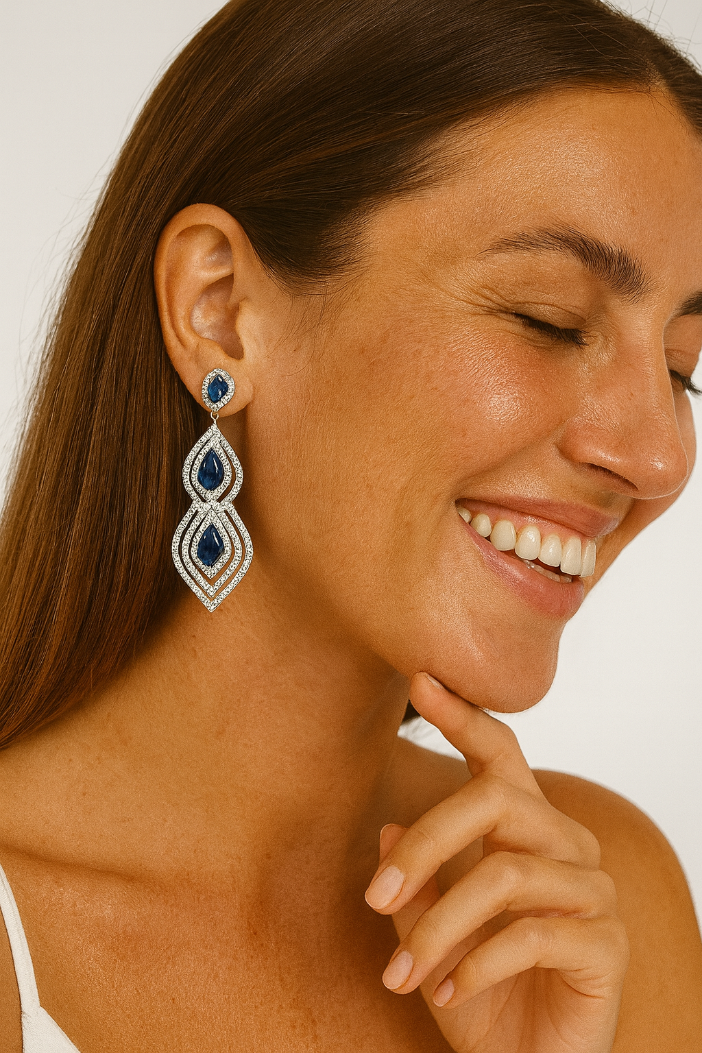 Let the Sapphire Cascade Drops take center stage — pair them with an elegant gown or sleek evening dress for a look that exudes timeless opulence and grace.